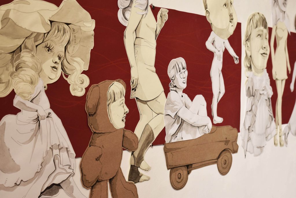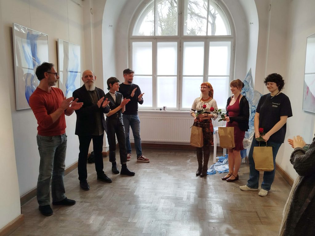 Na zdjęciach widoczna jest ekspozycja prac Magdaleny Prokop, Wiktorii Przegendzy i Elizy Jarosz oraz moment otwarcia wydarzenia.
