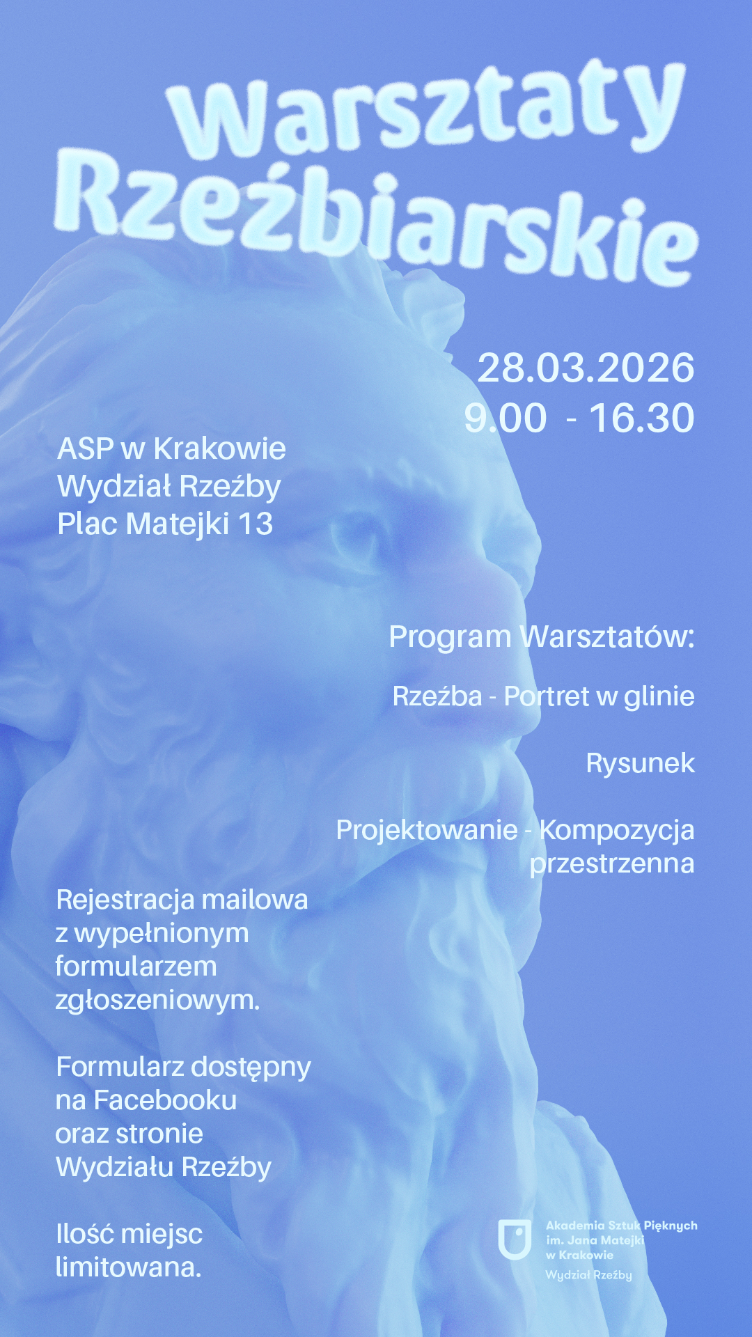 Zapraszamy na Warsztaty Rzeźbiarskie organizowane przez Wydział Rzeźby Akademii Sztuk Pięknych im. Jana Matejki w Krakowie (ASP Kraków). Wydarzenie odbędzie się 28 marca 2026 roku (sobota) w godzinach 8:00–16:30 na Placu Matejki 13, w ramach Dni Otwartych Drzwi ASP.